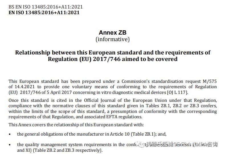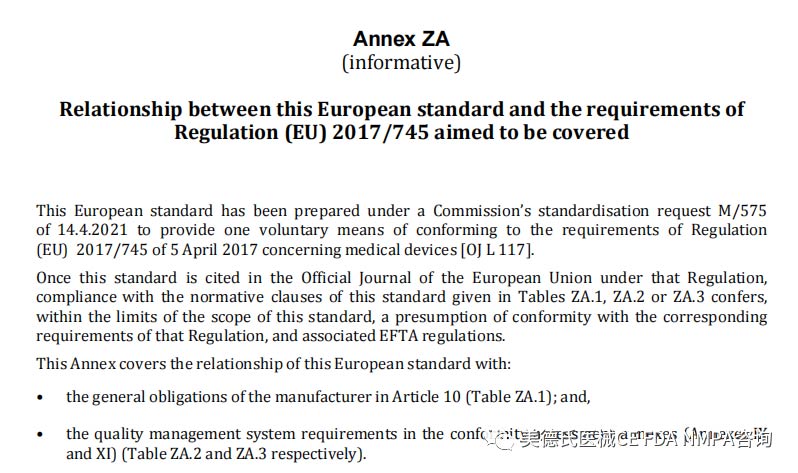 增加了與MDR條款的對應(yīng)關(guān)系,則符合表 ZA.1、ZA.2 或 ZA.3 中給出的本標準的規(guī)范性條款,即在本標準的范圍內(nèi) ,推定符合該法規(guī)和相關(guān) EFTA 法規(guī)的相應(yīng)要求。