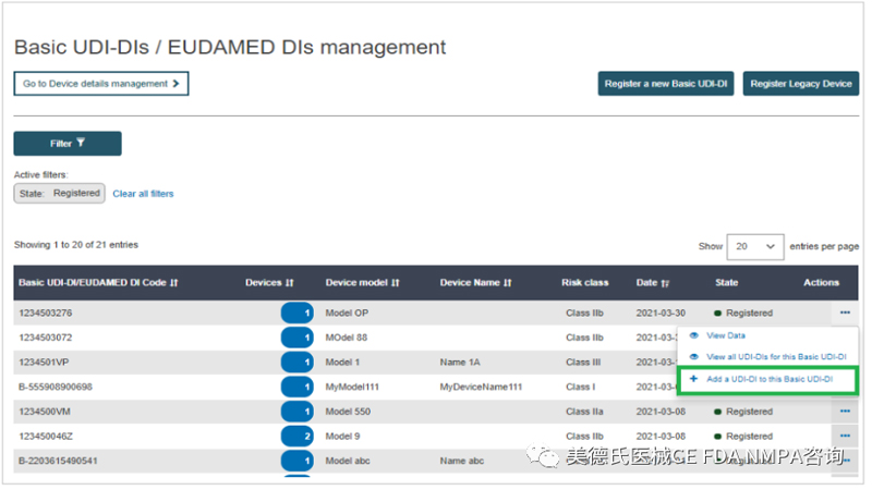 3.從結(jié)果中,找到要為其添加新的UDI-DI的Basic UDI-DI,單擊右側(cè)的三個點(diǎn),點(diǎn)擊“Add a new UDI-DI to this Basic UDI-DI: