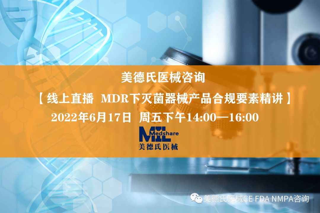 隨著MDR法規(guī)的正式實(shí)施,眾多廠家已經(jīng)開始籌備CE MDR認(rèn)證,為幫助企業(yè)應(yīng)對(duì)歐盟MDR法規(guī)的申請(qǐng),美德氏醫(yī)械咨詢將于 2022.06.17 日舉辦【MDR下滅菌器械產(chǎn)品合規(guī)要素精講】線上免費(fèi)培訓(xùn),特邀各企業(yè)屆時(shí)收看!